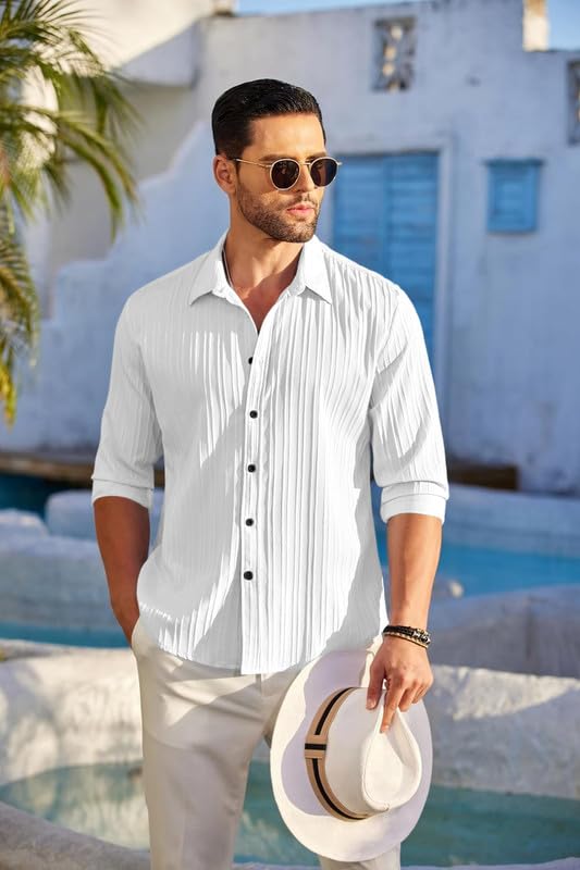 These breathable men’s shirts are the perfect choice for warm weather activities. With their lightweight cotton fabric and short sleeves, they allow maximum airflow to keep you feeling cool and comfortable on hot summer days. The loose fit is relaxed and casual, yet still flattering for any body type. Versatile white is easy to pair with shorts, pants or swim trunks. Wrinkle-resistant and quick drying, these shirts maintain their shape whether you’re lounging at the beach or enjoying active pursuits. The epitome of effortless style and comfort. Crafted with attention to detail, this shirt is designed for the modern man who values fashion. This casual long sleeve button-down shirt is perfect for any occasion. With its loose yet tailored fit, you’ll feel comfortable and stylish whether wearing it to the office, a wedding, or out for dinner and drinks. The soft cotton fabric feels great against your skin and breathes well so you stay cool. Small details like chest pockets and buttoned cuffs add functionality without compromising the clean, understated look. Subtle stripes and colors like light blue, white, and grey make this shirt versatile to pair with different bottoms.