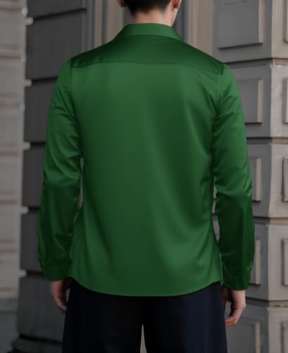 IndoPrimo Men’s Casual Button Down Long Sleeve Satin Plain Shirt Green