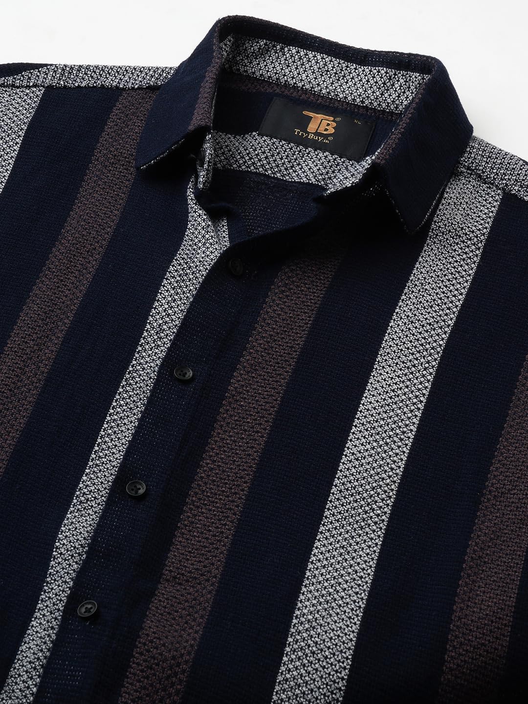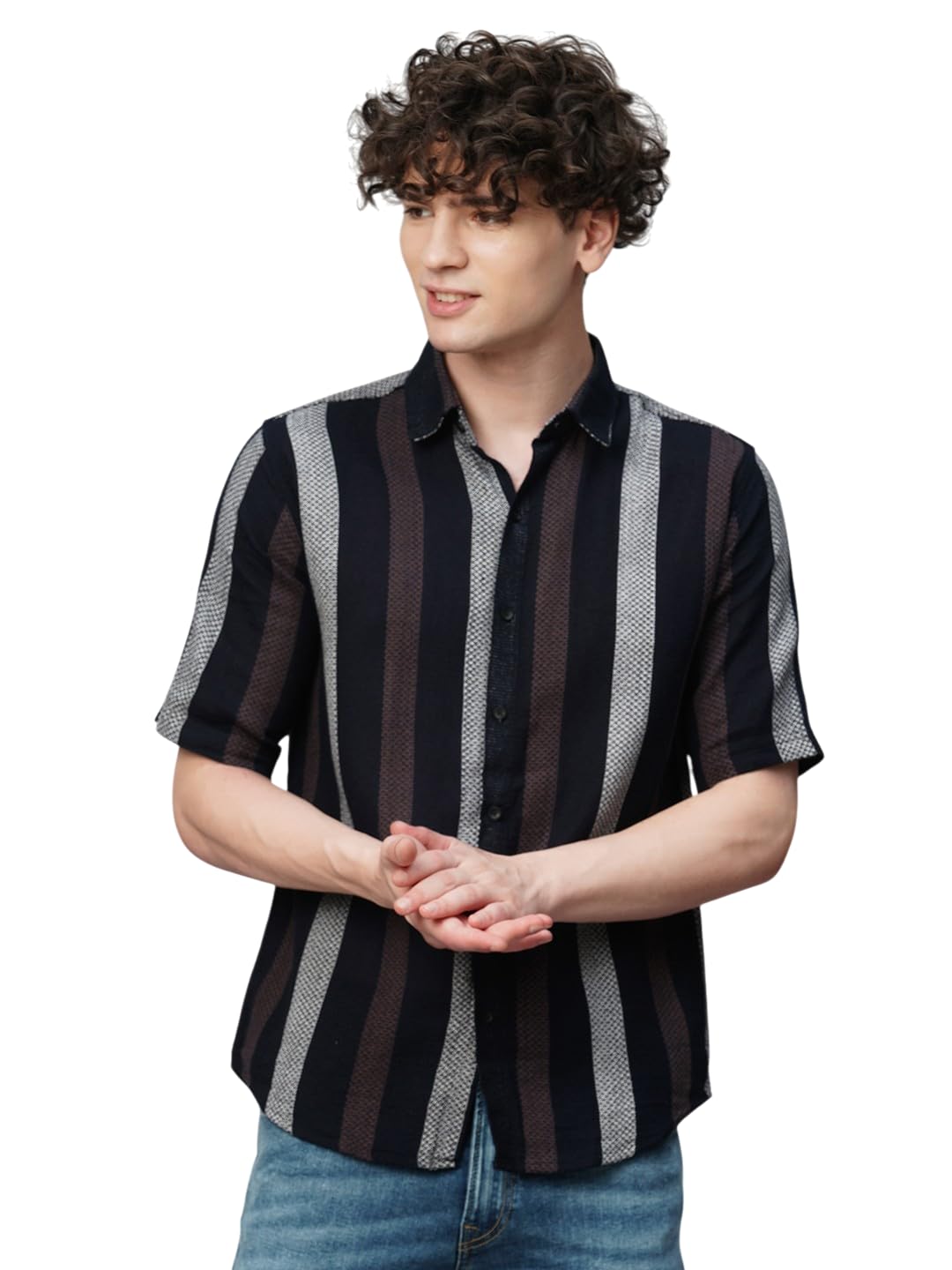 Elevate your casual wardrobe with this sophisticated striped short-sleeve shirt. The striking vertical pattern features a harmonious blend of black, grey, and navy stripes, creating a modern and versatile look. Crafted with attention to detail, this regular-fit shirt offers both style and comfort for everyday wear. The classic collar and button-front closure add a touch of refinement, while the short sleeves make it perfect for casual outings and warm weather. The shirt pairs beautifully with denim, as shown, or can be matched with chinos for a smart-casual ensemble. The comfortable regular fit ensures ease of movement without compromising on style. The textured stripe pattern adds visual interest and depth to the design, making it stand out in your wardrobe. Perfect for casual Fridays, weekend brunches, or evening gatherings, this shirt seamlessly blends contemporary design with classic comfort.