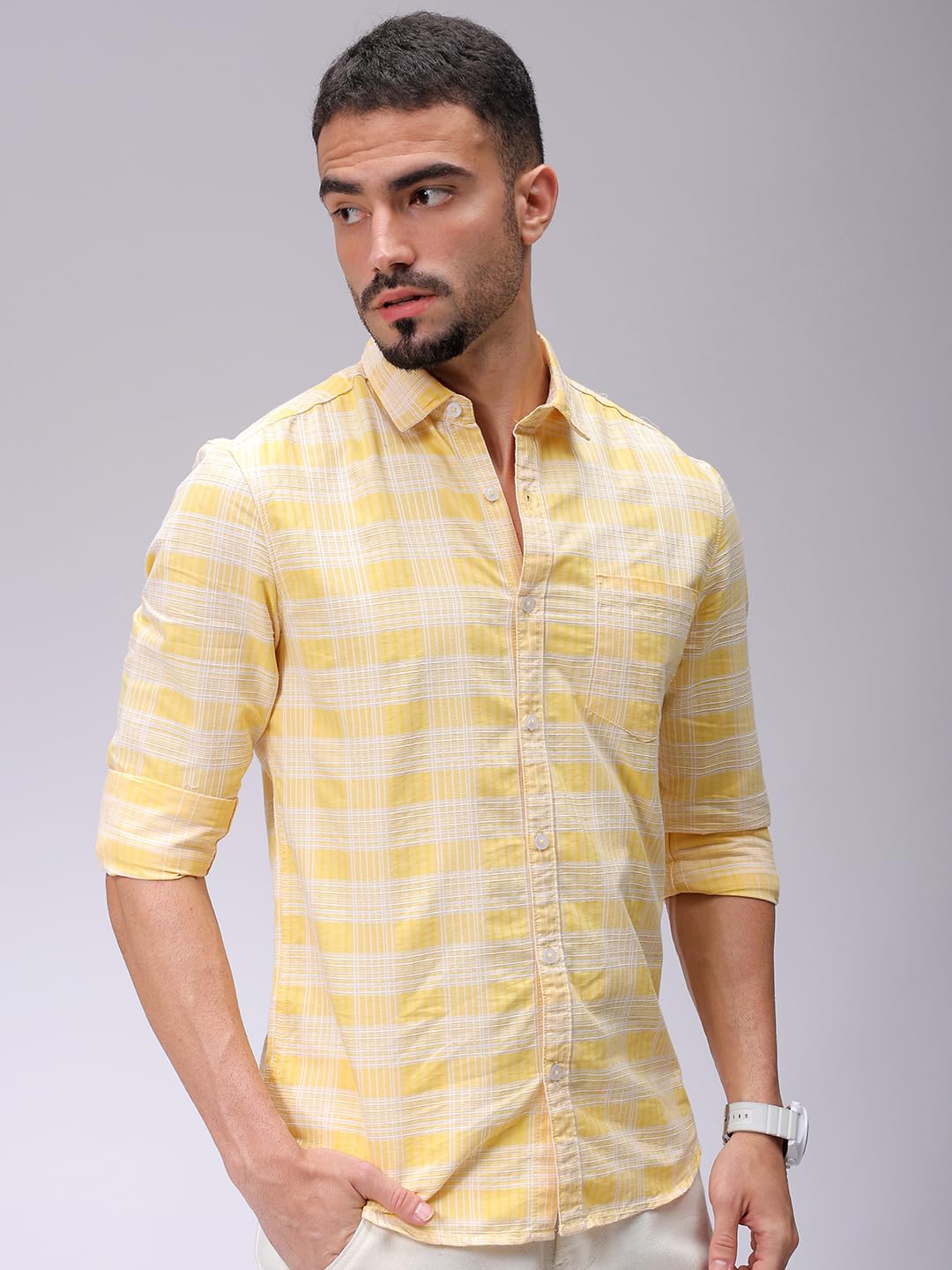This The Indian Garage Co Men Slim Fit Checked Casual Shirt has Cutaway Collar, Regular Length, Long Sleeves, Straight hem, Comes with a V Pocket and Button Closure