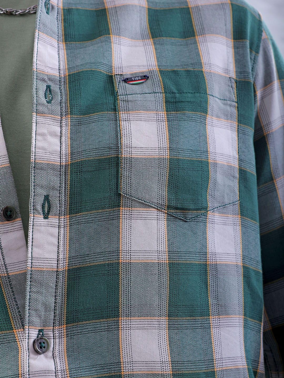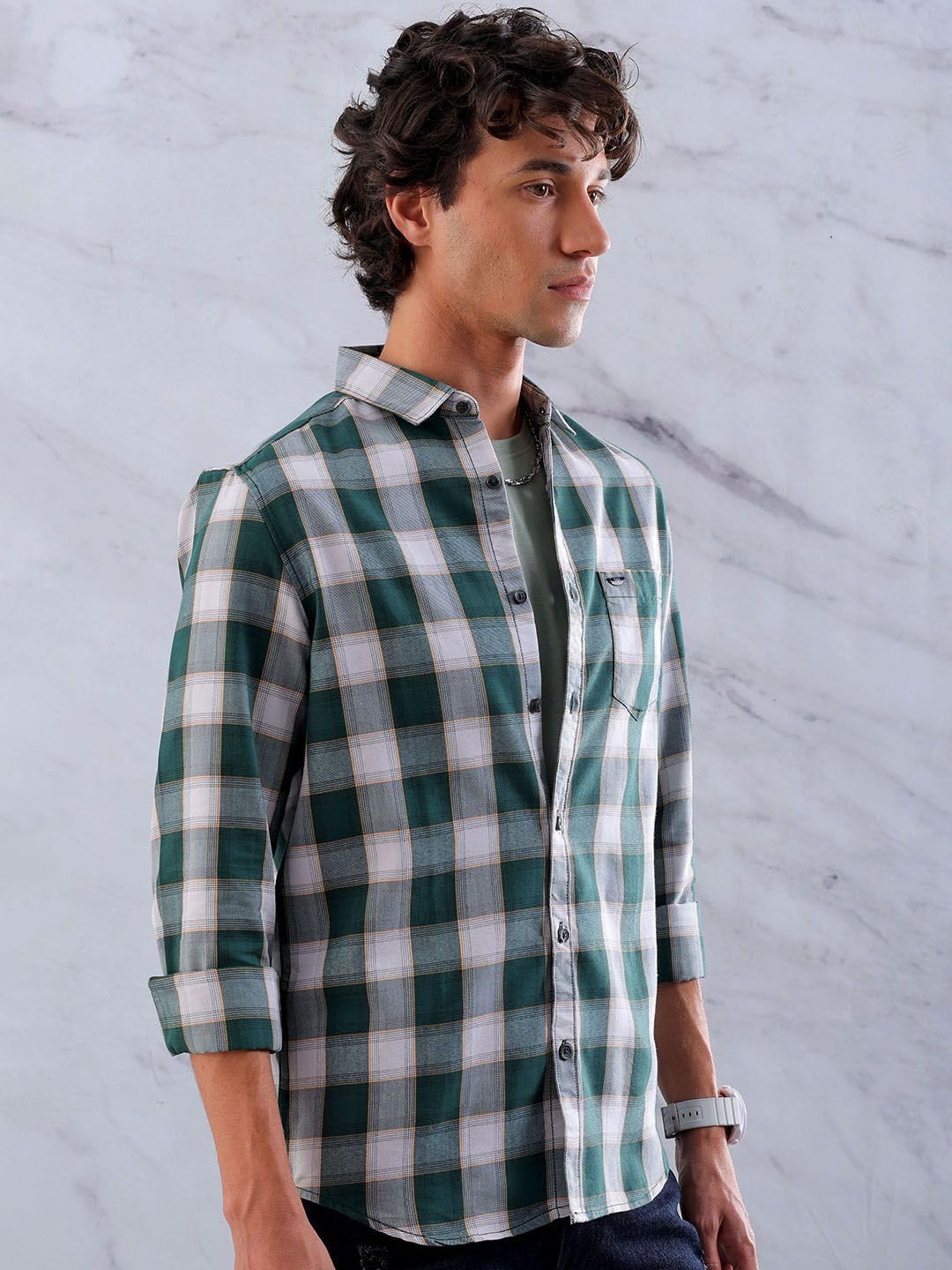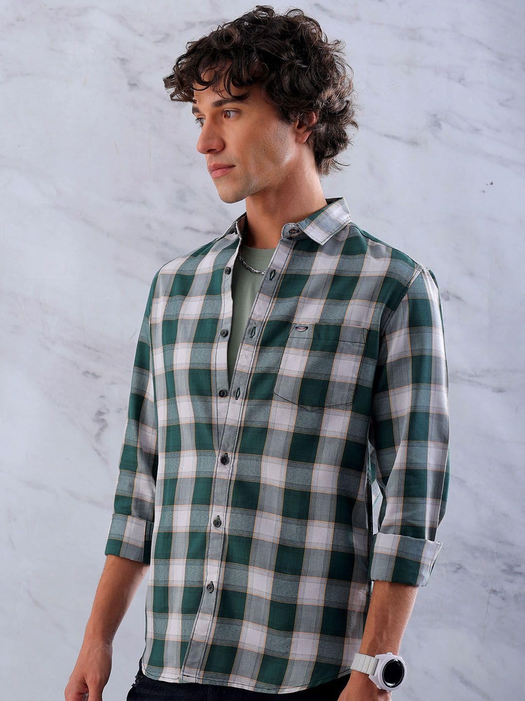 This The Indian Garage Co Men Green Slim Fit Checked Casual Shirt has Cutaway Collar, Full Sleeves, Curved hem and Button Closure